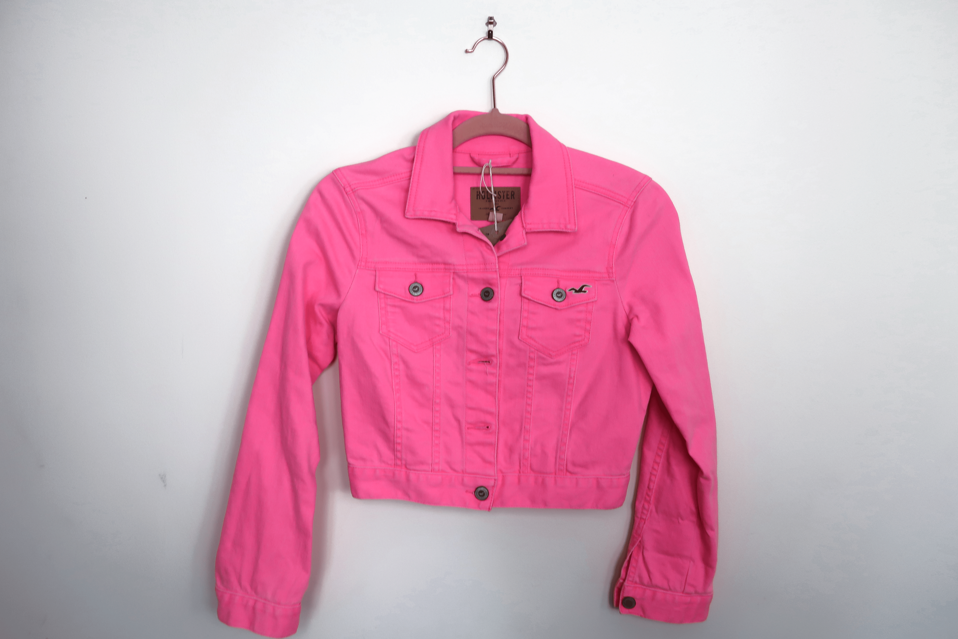 A beautiful one-off custom cropped neon pink denim jacket that has been lovingly hand-painted with a funky cactus on the back panel.