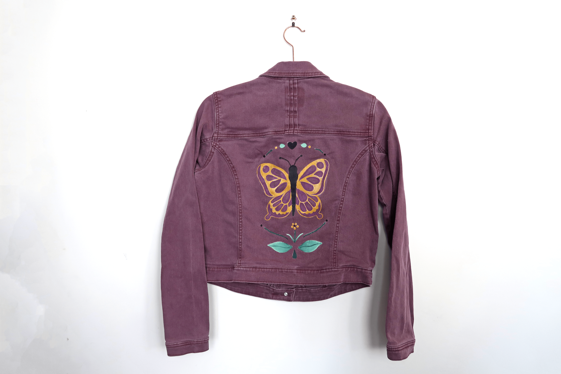 A beautiful one-off custom purple denim jacket that has been lovingly hand-painted with a butterfly on the back panel.