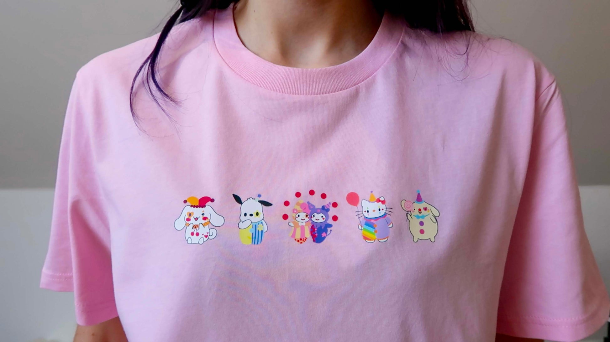 Celebrate your love for clowns and Sanrio with this adorable pastel pink t-shirt, featuring beautifully printed Sanrio friends dressed as fun clowns. Crafted from a soft 100% Organic Compact Ringspun Cotton Single Jersey for all-day comfort, this shirt is perfect for gaming sessions, casual wear, or as a thoughtful gift for Sanrio fans. The Available in a range of sizes to suit every style!