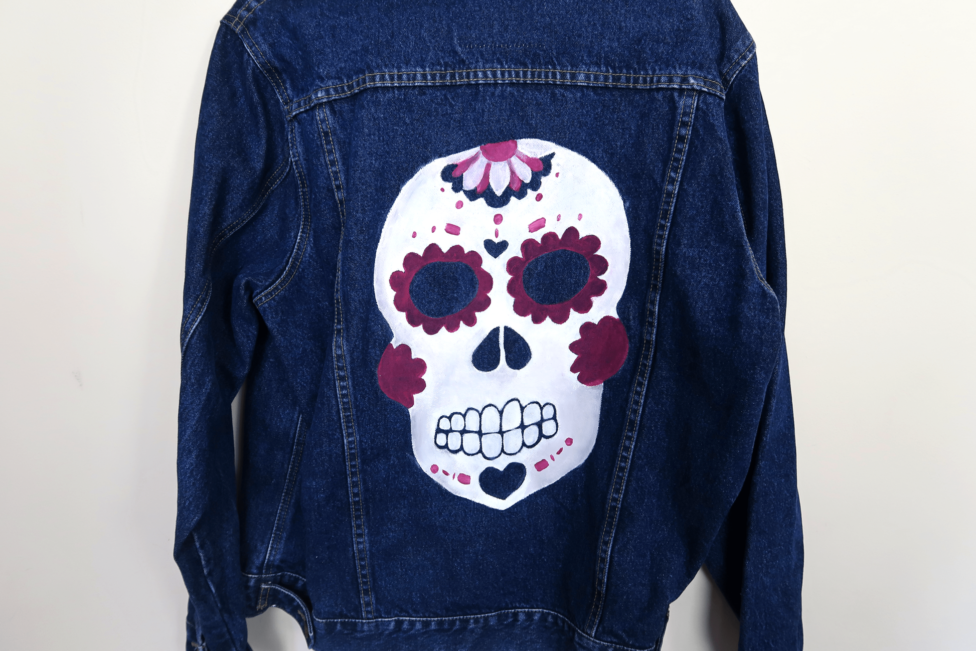 A one-off custom oversized men’s denim jacket that has been lovingly hand-painted with a sugar skull on the back panel.